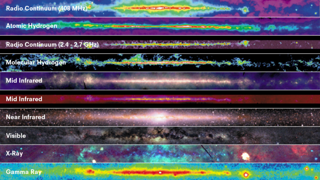 This widefield view of the galaxy show how the various wavelengths image the various components, including gaseous ISM express themselves to us over the entire elecromagnetic spectrum (Credit: The Electromagnetic Spectrum - COSMOS Education)
