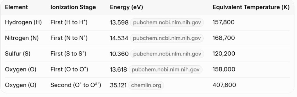 Generally, far UV light wavelength/energy availability is required to ionize the specific element to form forbidden emissions. Excess photon is used to energize freed electrons. Due to the different nature of electron / ion collisions, heat is not readily transferred between the two in ion plasma. This can yield an electron temperature different from, and generally much higher than the ion temperature.