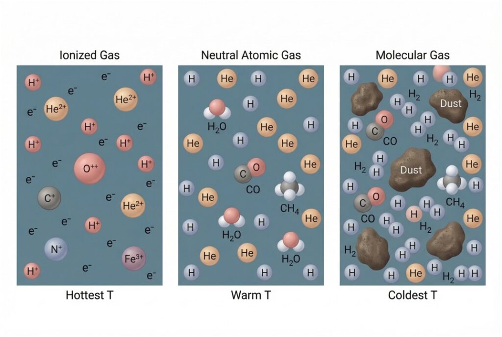 The ISM’s multi-type nature—ionic, atomic, and molecular—arises from thermal and chemical balances, with gravity, friction, turbulence and magnetic fields adding complexity.  Gas chemistry, including ions, atoms, and molecules of heavier elements drive the transitions between gas types and the interactions of the gas bodies with light.