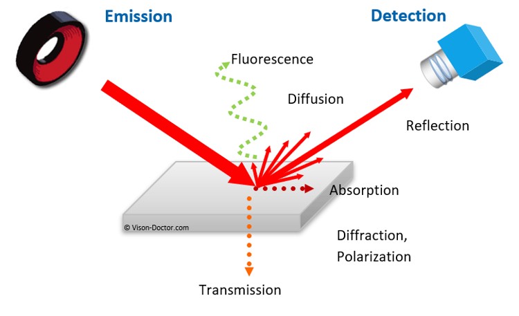 This image, borrowed from a vision engineering site, illustrates scattering (shown as diffusion), absorption, emission, flourescence (spectroscopy or Stokes re-emission), reflection, and transmission: In most ISM, transmission overwhelmingly dominates - yielding the ISM not optically visible. (Credit vision-doctor.com)