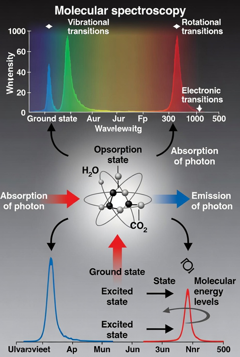 Molecular spectroscopy in space builds upon atomic spectroscopy by examining the interactions of light with molecules rather than individual atoms, revealing the complex chemistry of the cosmos. In interstellar clouds, planetary atmospheres, and comets, molecules such as carbon monoxide (CO), water (H₂O), ammonia (NH₃), and even complex organics like polycyclic aromatic hydrocarbons (PAHs) exhibit unique spectral signatures through vibrational and rotational transitions. These occur primarily in the infrared, millimeter, and radio wavelengths, where photons match the energy differences between molecular states.