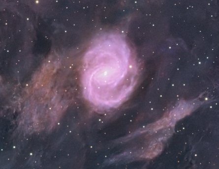 Otherwise, the image is full of easter eggs, including the purple (combination of blue reflections and Halpha emissions) of the Iris Nebula itself, and the spiral galaxy colour, whose light has undergone interstellar reddening via preferential scattering of blue light by the dust.