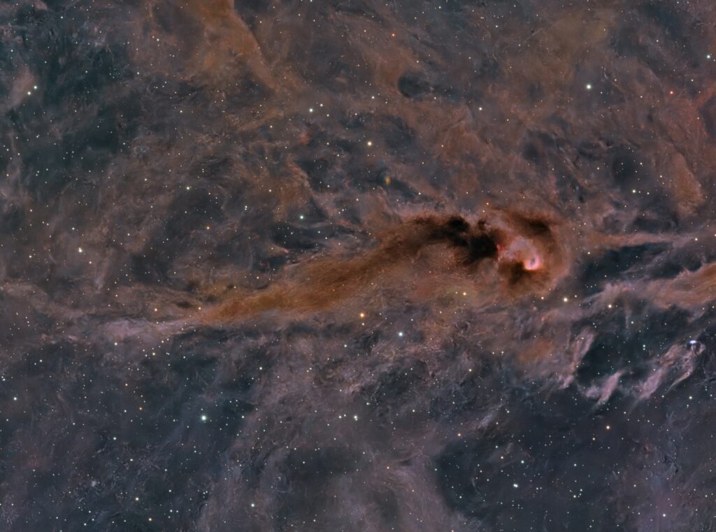 Near the tip of the Arrow dark nebula (LDN468) in this closeup lies Guylbudaghian's Nebula (HH215), a Herbig Haro jet that is diagnostic of a new star forming with the depths of a dark nebula. This is one of the few places where hydrogen molecules and atoms are sufficiently warmed to present light that we can image. Admittedly some of this light is likely Halpha with some light also coming from heavier elements and molecules. The other place hydrogen is directly optically evident is the accretion disks around other condensed bodies.