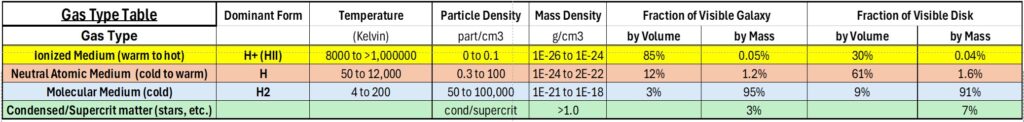 For our current objectives, there are a couple of relevant things to note, stars – that form the energy source that drives the galactic machinery and gas dynamics – planets, and condensed exotics form only 3% of the entire galactic mass, and only 7% of the mass of the visible disc.  The percentage of space occupied by the condensed or supercritical stars and planets is negligible.